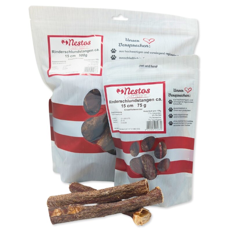 Nesto´s getrocknete Rinderschlundstangen wird von uns in Österreich produziert, sind frei von chemischen Zusätzen, Konservierungsmittel & künstlichen Geschmacksverstärkern.