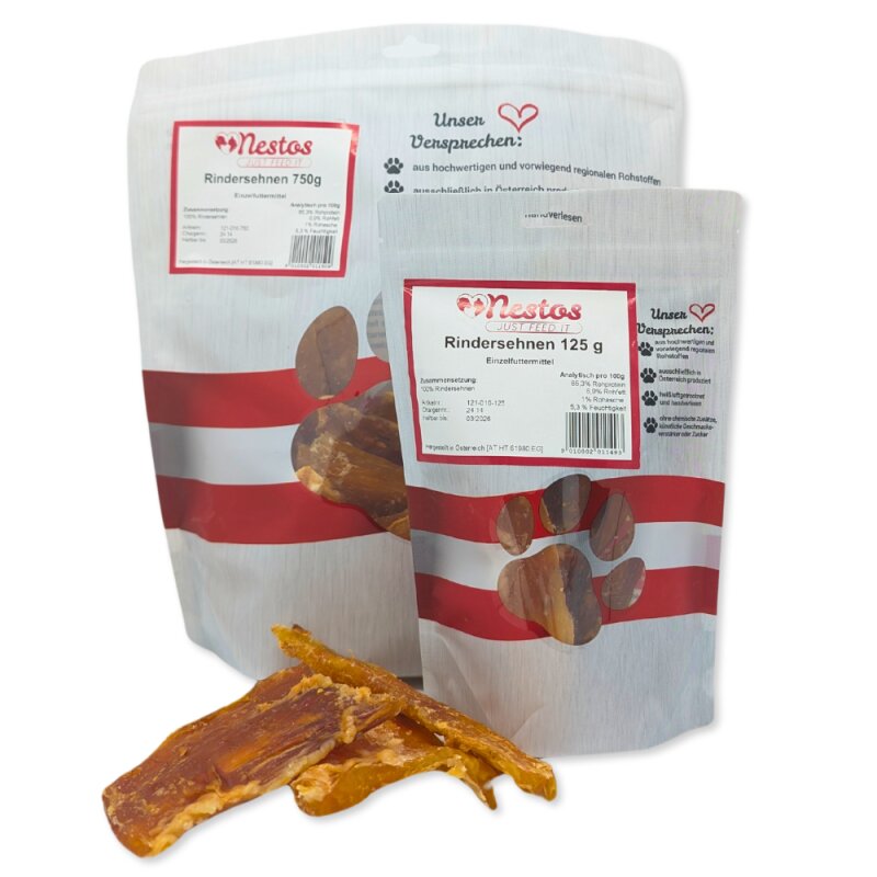 Nestos Rindersehen werden ausschließlich Heißluft getrocknet und handverlesen verpackt. Die Rindersehnen sind frei von jeglichen chemischen Zusatzstoffen, Geschmacksverstärker und Zucker.